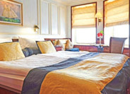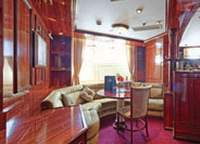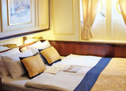 volts. Deluxe Deck Cabin, double beds, mini bar, marble bathroom with whirlpool, cabin doors open onto deck.